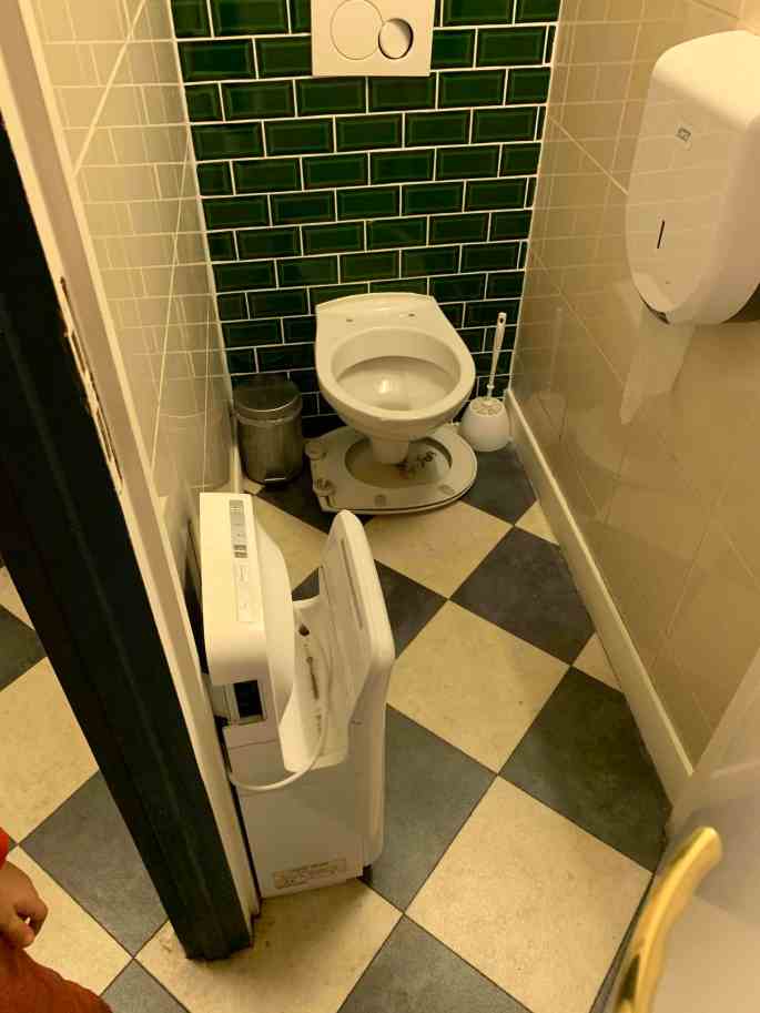 Il faut comprendre que nous sommes Ć quai depuis plus d’un mois, sans possibilitĆ© de bouger sĆ©curitairement le bateau Ć cause de l’arche. Vahana a une capacitĆ© limitĆ©e pour ses rĆ©servoirs d’eaux noires et nous ne pouvons pas nous dĆ©placer vers le lieu des pump-out, cāest-Ć -dire Ć©vacuation des eaux noires (toilette). Avec 4 personnes Ć bord Ć temps plein, il faut donc tenter le plus souvent possible de nous dĆ©placer au bloc sanitaire et privilĆ©gier les toilettes publiques souvent douteuses (voir un exemple sur la photo Ć droite) si on ne veut pas faire dĆ©border nos rĆ©servoirs. Il faut donc compter qu’aller aux toilettes est souvent une expĆ©dition d’une bonne quinzaine de minutes aller-retour sous la pluie.