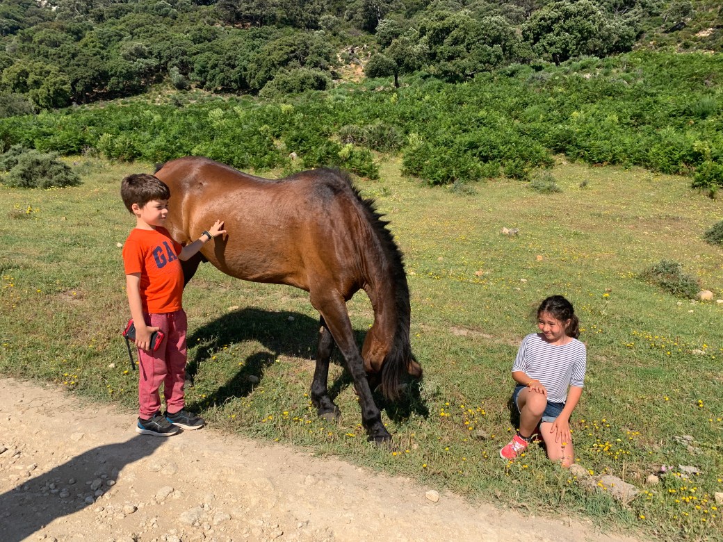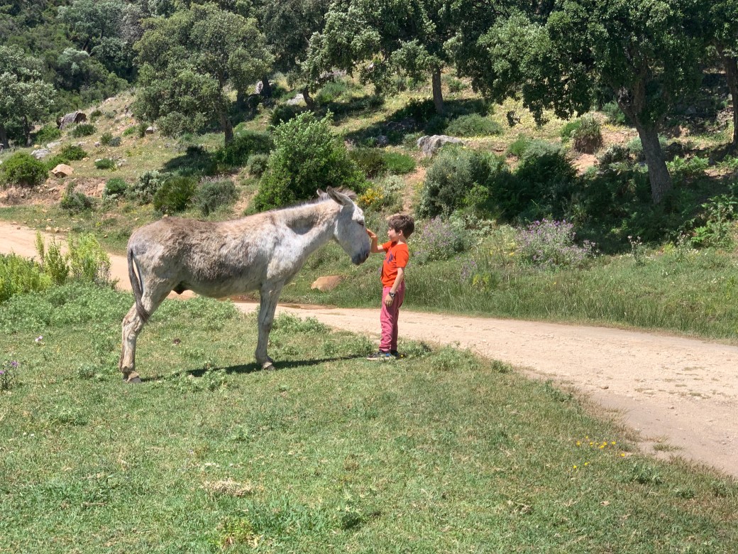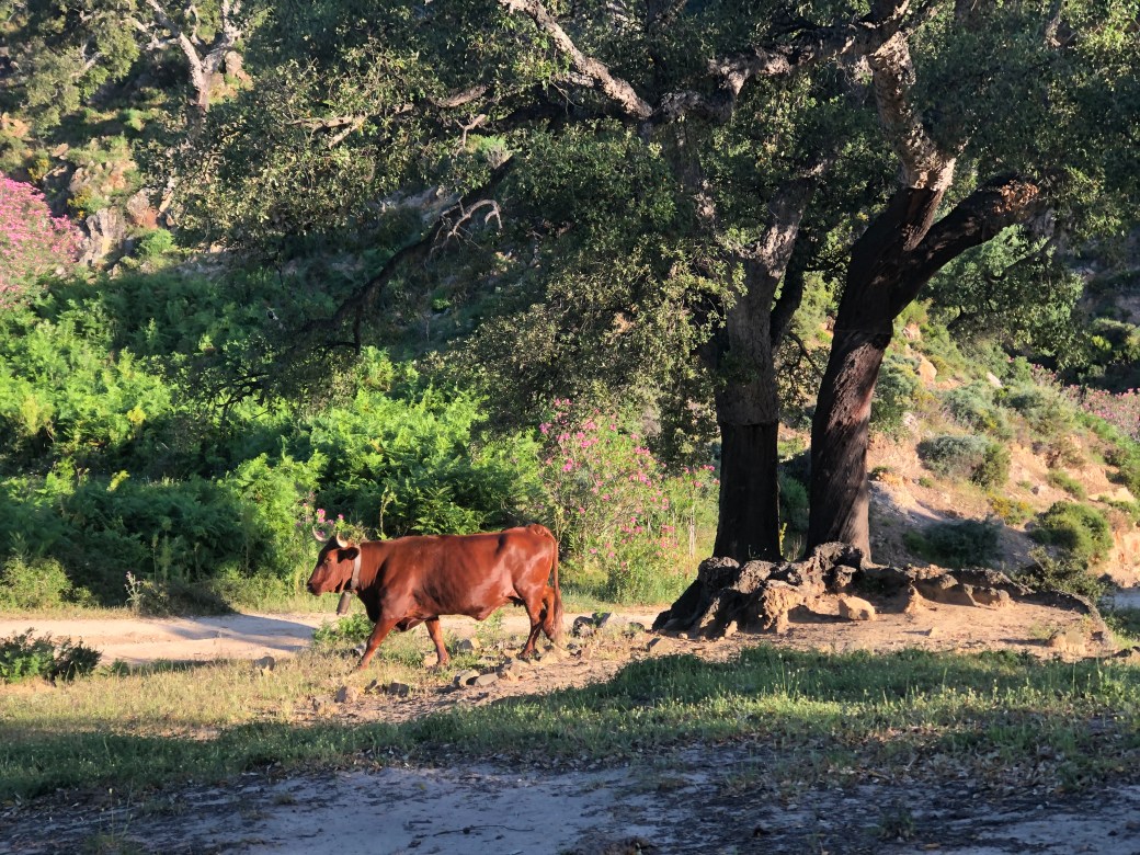 Dès que le déconfinement s’assouplit, nos voisins nous invitent pour quelques jours chez eux, à Tarifa. Ils habitent un parc naturel où les animaux circulent librement. Ce sont les maisons qui sont clôturées, pour éviter que les animaux piétinent les jardins! Leur décor est époustouflant, de nombreux arbres liège, des montagnes, des chevaux, vaches, cochons, etc.