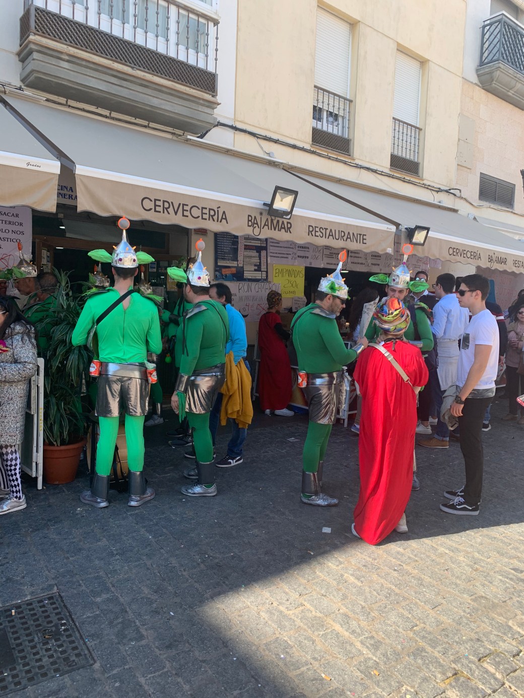 Dès notre arrivée à Cadix, un air de fête se fait sentir. C’est par pur hasard que nous mettrons les pieds à Cadix, en pleine période de carnaval. Ce carnaval est très réputé et de nombreux gens le fréquentent, c’est le deuxième carnaval en importance après celui de Venise. On compte des centaines d’autobus dans les stationnements qui desservent les lieux. Pour le carnaval, les gens se regroupent entre amis et famille et se costument. Les rues sont bondées et les gens chantent allègrement des chansons recomposées inspirées de textes humoristiques et sociopolitiques.
