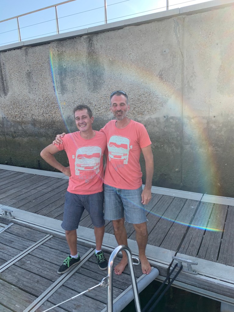 Quand le soleil se lève, François remarque que nous sommes suivis par un flotteur de cage de pêcheur. Il faut dire que la côte en est parsemée comme un champ de mines. Comme le mentionnait notre ex-skippeur Anthony, le jour on les évite et la nuit c’est au petit bonheur la chance! En fait, nous le tirons. Nous réussissons à couper les cordages mais comme on ne sait pas s’il y a des bouts coincés autour du safran ou de l’hélice, on n’ose pas partir le moteur. Le temps frisquet invite peu à la plongée en cette heure matinale, c’est donc avec la GoPro immergée avec une perche télescopique sous l’eau, que nous confirmerons que tous les cordages sont disparus et que nous pouvons utiliser le moteur pour l’approche au quai.