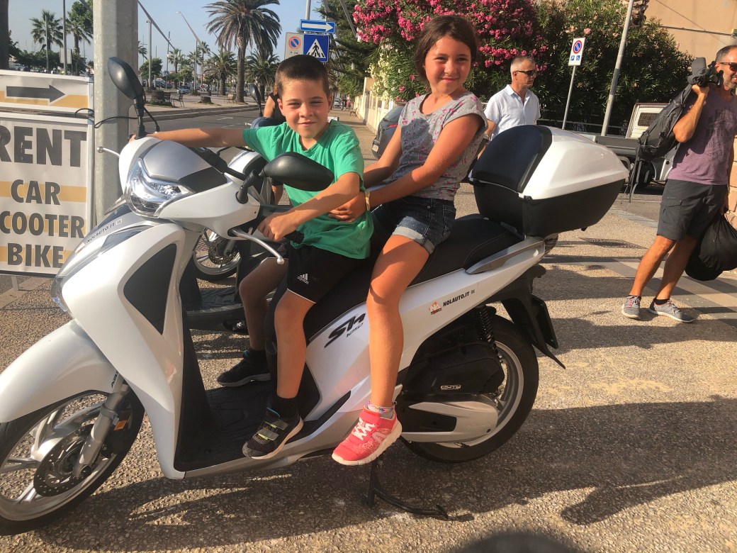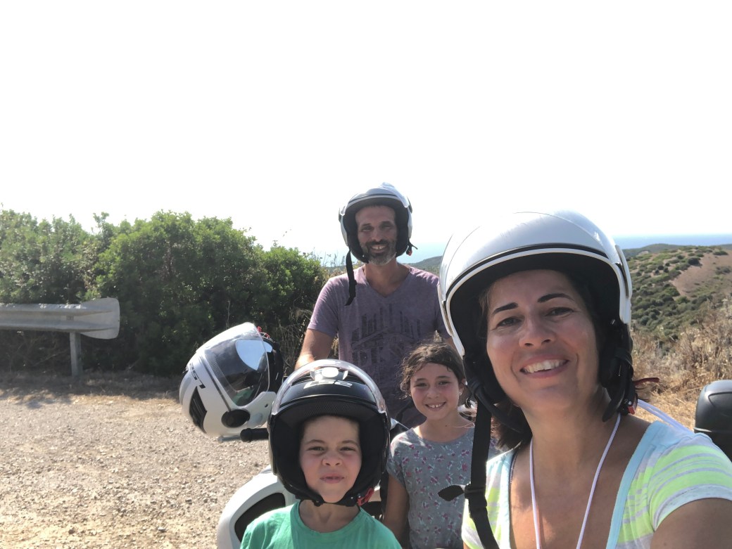 Le transport en commun n’est pas très développé sur l’île. C’est en jasant avec des voisins de quai que nous avons l’idée de louer des scooters pour aller découvrir l’intérieur des terres. Arrivés au centre de location, on réalise vite qu’il n’y a pas de casque de moto disponible pour les enfants. Déception! Qu’à cela ne tienne, on a repéré un Suzuki et on achète des casques pour eux en se disant qu’à chaque future location, ça simplifiera la chose.