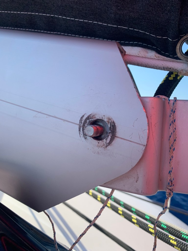 Jour 2 de la traversée, au petit matin, les enfants dorment encore alors qu’on est dehors et qu’on entend un “bling bling” inhabituel. On tente de trouver la source de ce bruit étrange. Une inspection visuelle nous amènera à trouver sur le pont un anneau métallique (“washer”). En relevant la tête, on remarque que le boulon qui retient la bôme (partie structurelle horizontale sur laquelle repose la grand-voile) n’est plus en place. La jonction ne tient que par une tige libre et peu convaincante qui à chaque mouvement du bateau s’éloigne de plus en plus de sa position et risque de tomber.
