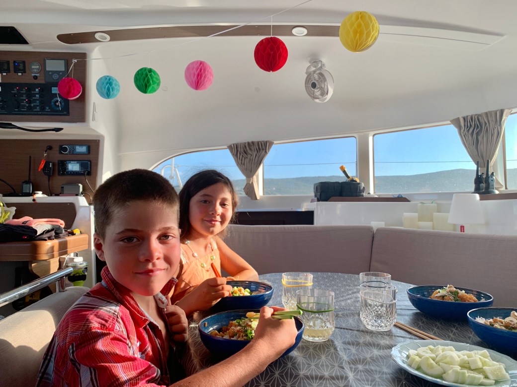Pour l’occasion, nous rabaissons la table intérieure afin d’aménager un coin détente. Les enfants ressentent souvent le besoin de s’allonger durant de longues navigations et le carré extérieur devient vite encombré de deux petits moussaillons très étendus. On tente donc l’expérience de cette nouvelle disposition, sachant que la cuisinière devra sacrifier son espace de travail puisque c’est généralement sur la table intérieure que s’effectue la préparation des repas.