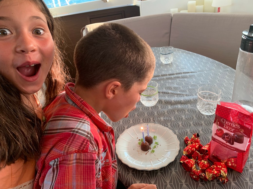 Nous passerons l’anniversaire des 8 ans de Jacob dans notre premier coup de vent. Comme s’était prévu, nous nous étions bien préparés. Nous avions enlevé les toiles, sécurisé le bateau. Nous avions plongé pour bien vérifier l’ancre la veille. Nous aurons rencontré des vents de 35-40 noeuds (65-75 km/h) avec des rafales à 45 noeuds.(+ de 80km/h). On attend que ça passe!