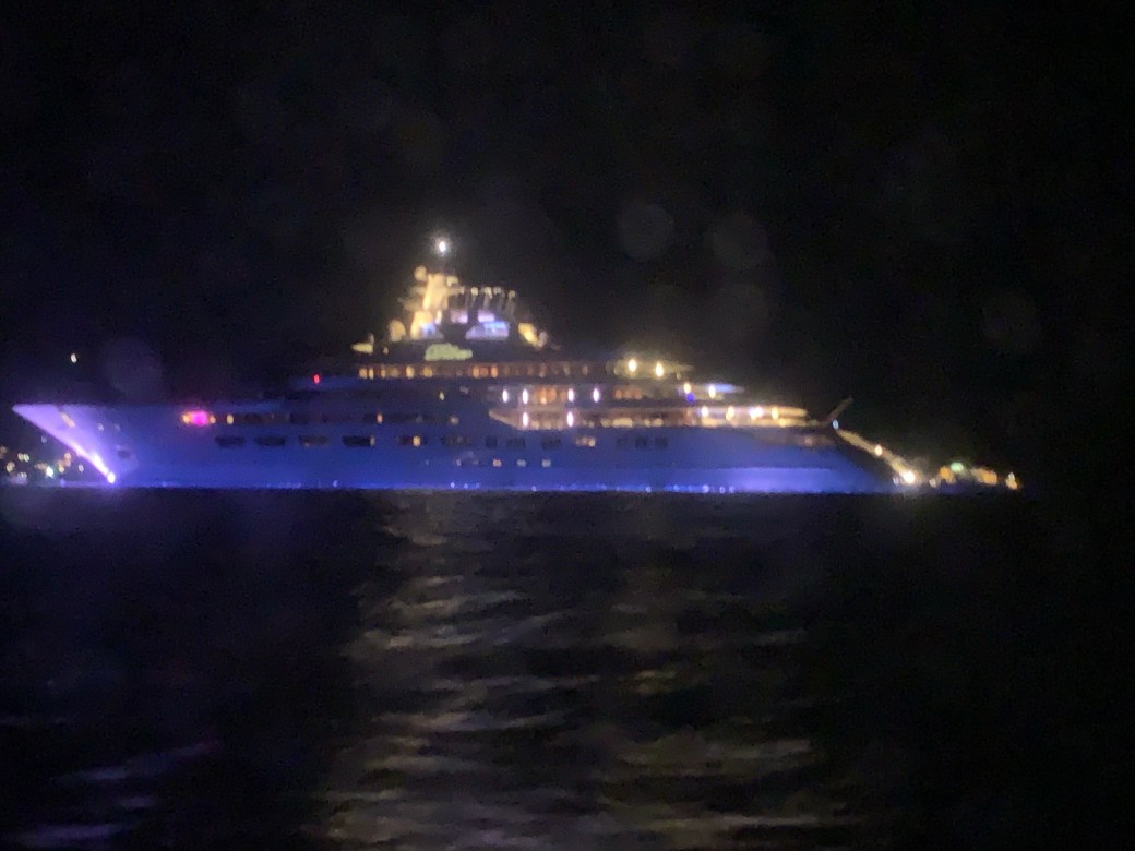 Un matin, nous nous réveillons à quelques mètres du Dilbar . Il est venu s’ancrer tout près de nous durant la nuit. Ce mega yacht privé de 156m appartient à un richissime russe. Construit au coût de 600 millions de dollars US, il peut accueillir 40 invités et 80 membres d’équipage. Ici, c’est la démesure!